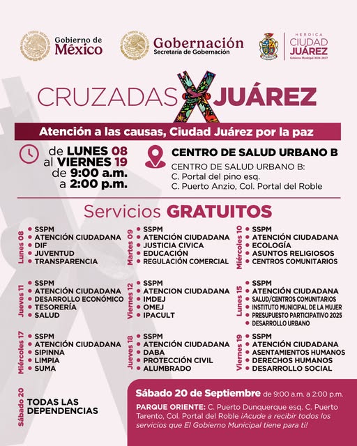 El programa “Atención a las Causas, Ciudad Juárez por la Paz” está contemplado para relizarse este sábado 20 de septiembre de 9:00 de la mañana a 2:00 de la tarde en el Parque Oriente, ubicado en Puerto Tarento y Puerto Dunquerque, en la colonia Portal de Roble.