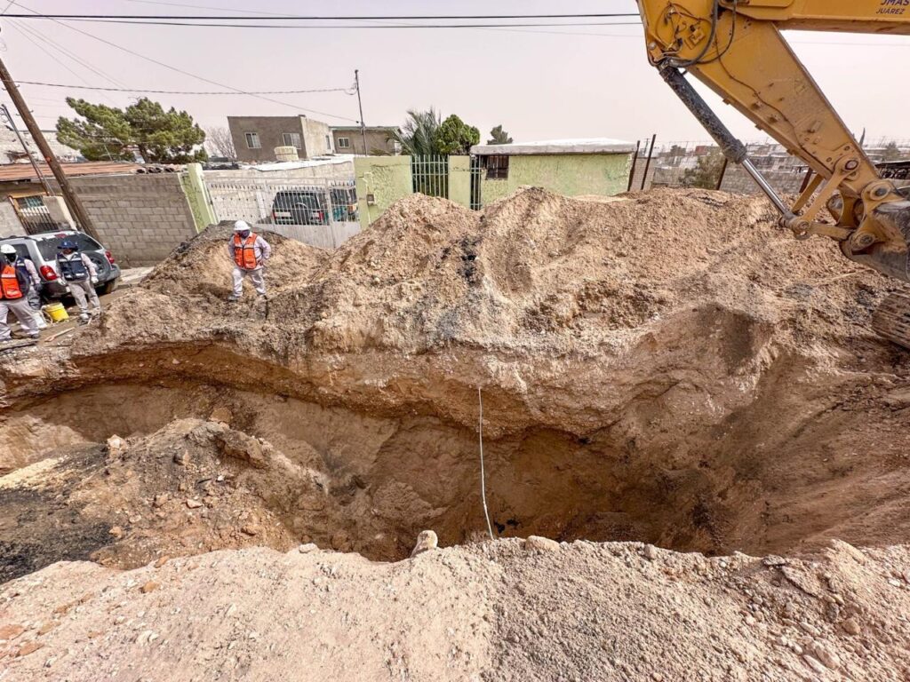 Un socavón de grandes dimensiones y profundidad se registró sobre la avenida División del Norte, en el tramo que se ubica entre Ignacio Alatorre y Pinotepa, donde ya laboran trabajadores de la Junta Municipal de Agua y Saneamiento (JMAS) de Juárez en su reparación.