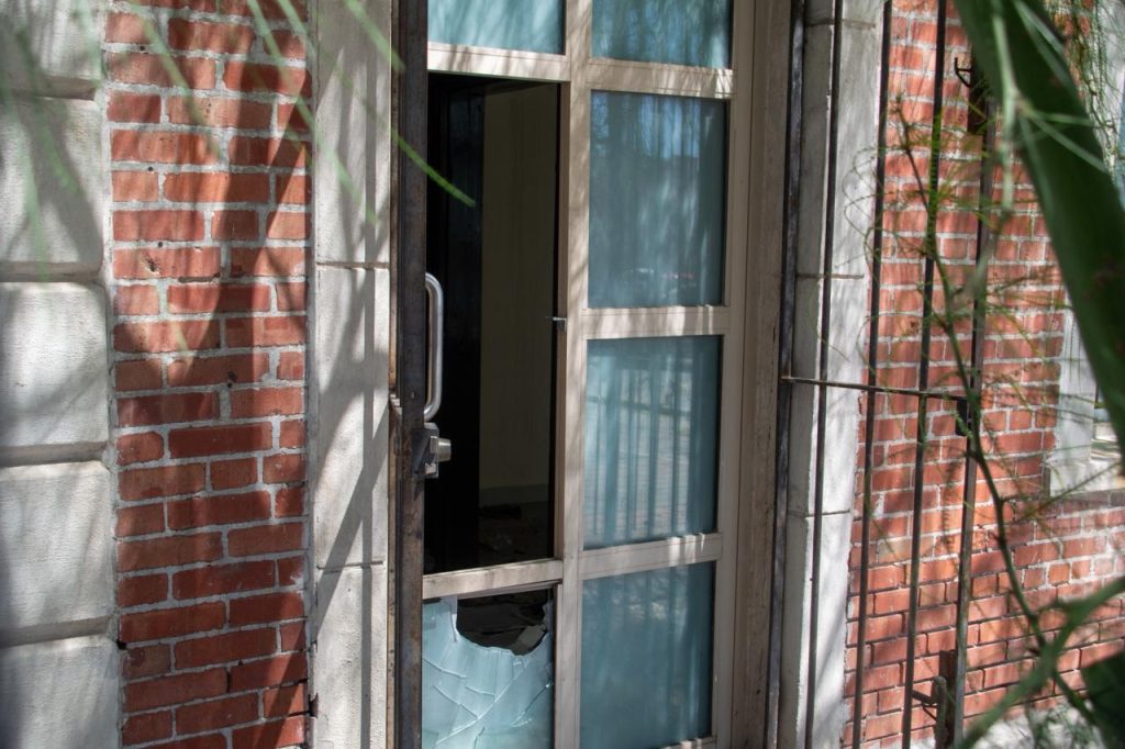 Algunas de las ventanas, se encuentran visiblemente rotas, por golpes de algún objeto, así como la entrada principal de este lugar, cuyos vidrios de la puerta, yacen en el suelo, junto con algunas envolturas y basura que quedaron atoradas sobre el árbol que da sombra al edificio.