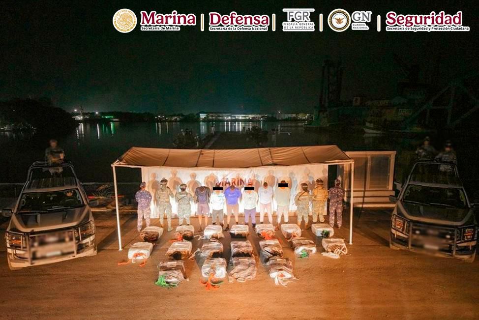 PUERTO CHIAPAS, Chiapas.- Elementos de la Secretaría de Marina (Semar), a través de la Armada de México en funciones de Guardia Costera, en coordinación con la Secretaría de Seguridad y Protección Ciudadana (SSPC) y la Fiscalía General de la República (FGR), aseguraron una embarcación menor que transportaba aproximadamente 904 kilogramos de cocaína y detuvieron a seis personas de nacionalidad extranjera.