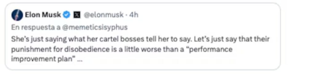 En el mensaje, el empresario afirmó que la mandataria “solo dice lo que sus jefes del cártel le indican”, insinuando represalias internas en caso de desobediencia, afirmaciones que fueron calificadas por el gobierno federal como infundadas y ofensivas para las instituciones del Estado mexicano