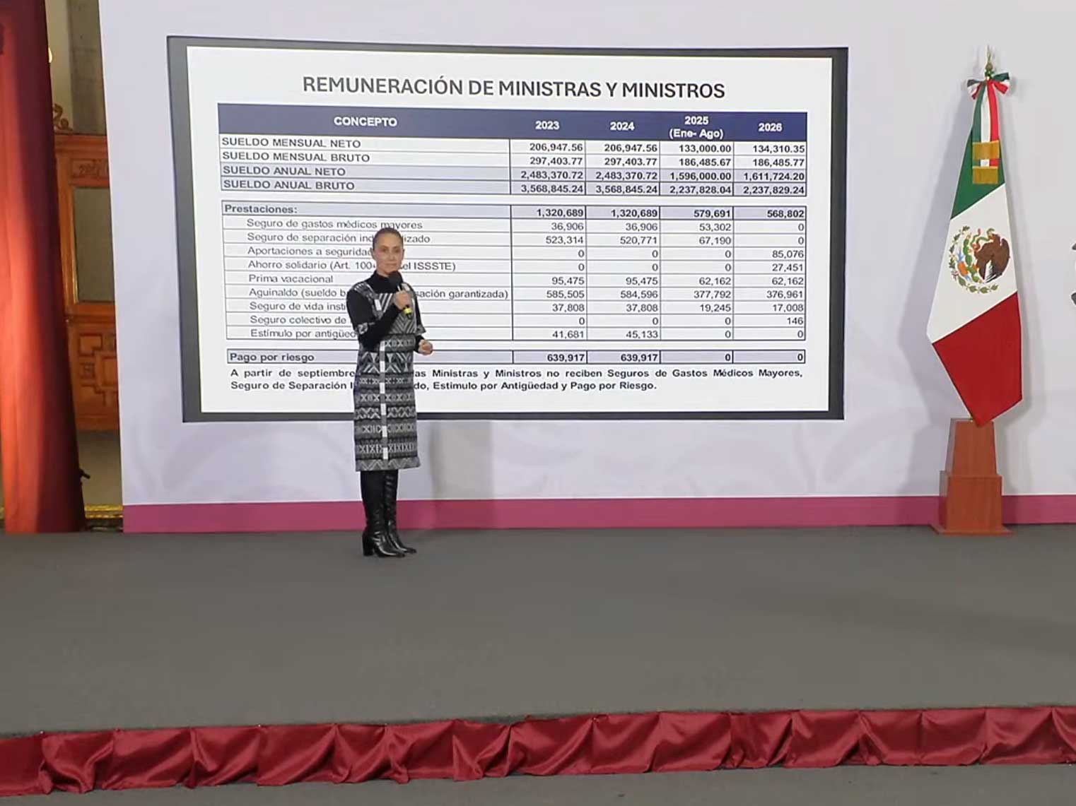Durante la Mañanera del Pueblo, la presidenta Claudia Sheinbaum Pardo exhibió los sueldos, bonos y privilegios de los exministros de la Suprema Corte, al señalar que formaban parte de un esquema de excesos y beneficios ajenos a la función pública dentro del viejo Poder Judicial.