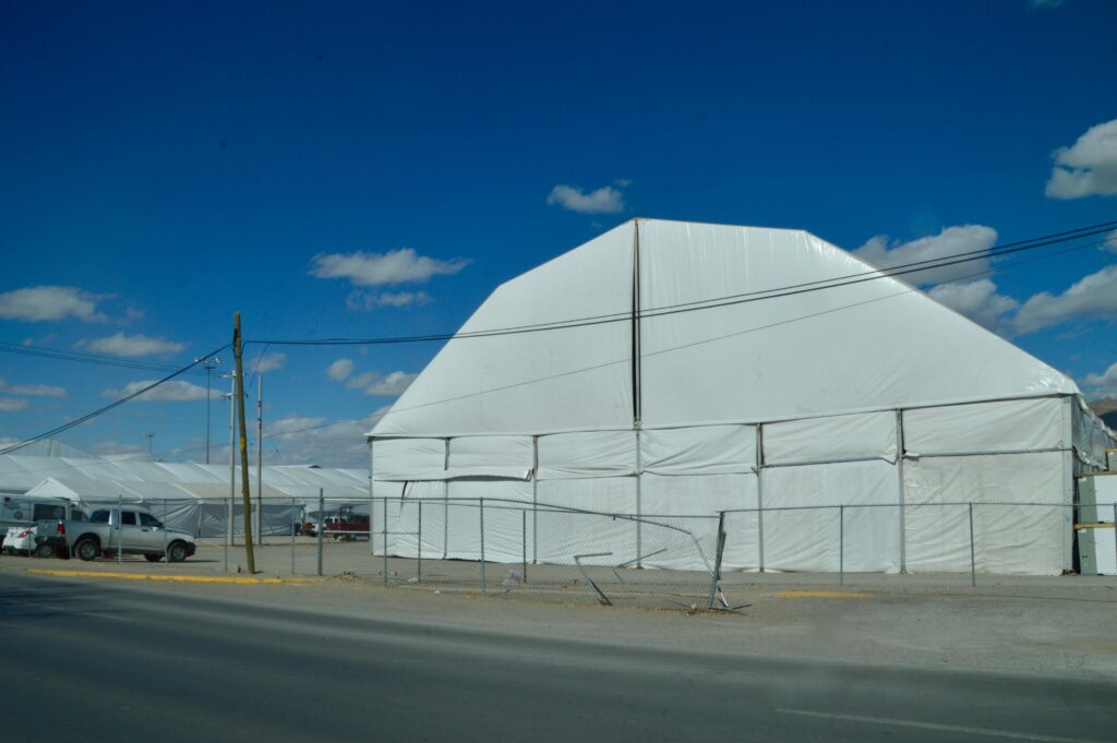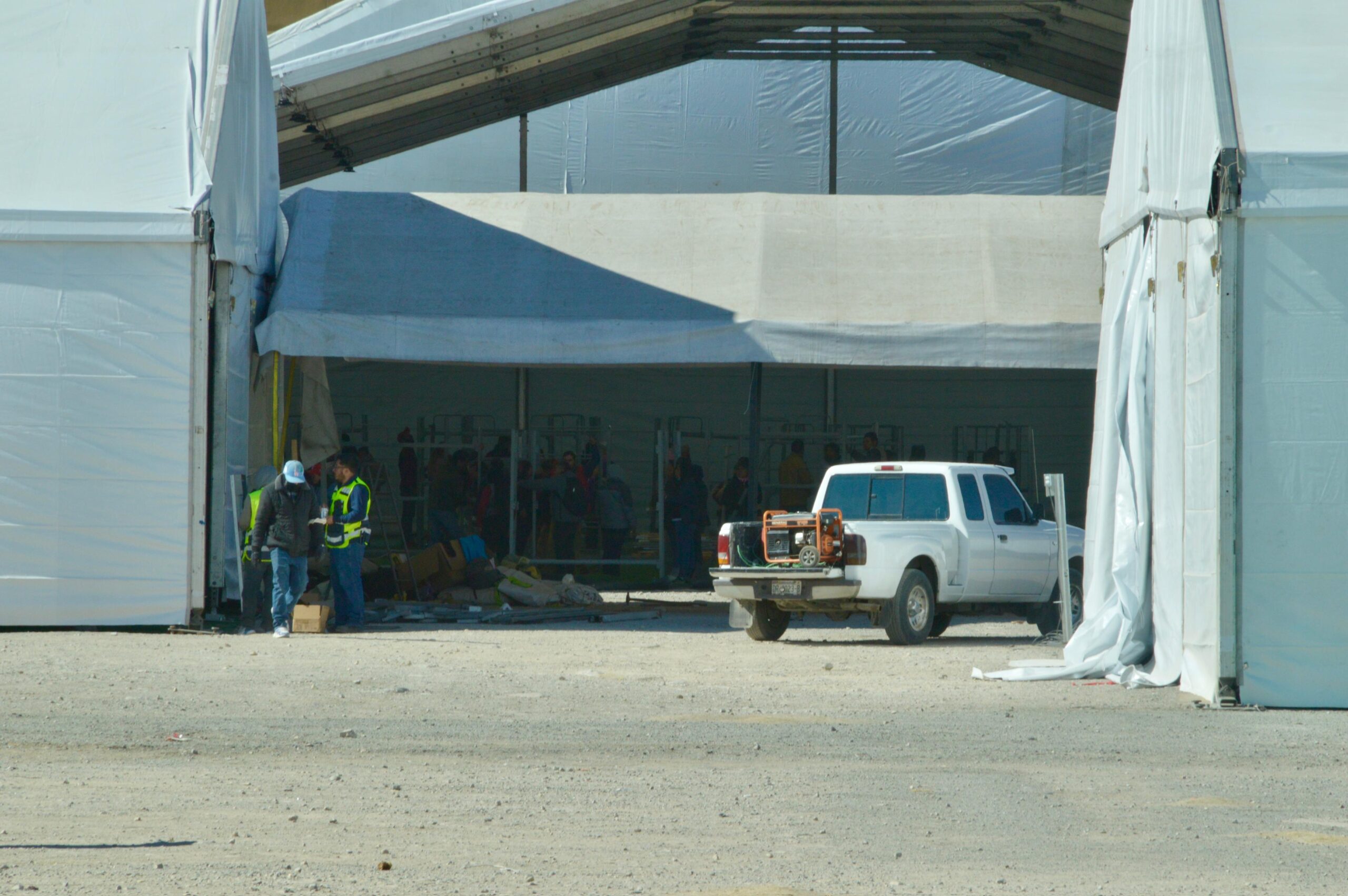 Pese a la presencia de ráfagas superiores a los 40 kilómetros por hora, trabajadores en el Centro de Atención a Migrantes de El Punto realizan a marchas forzadas la instalación de literas y colchonetas en la docena de carpas preparadas para recibir a migrantes mexicanos deportados por el Gobierno de Estados Unidos.