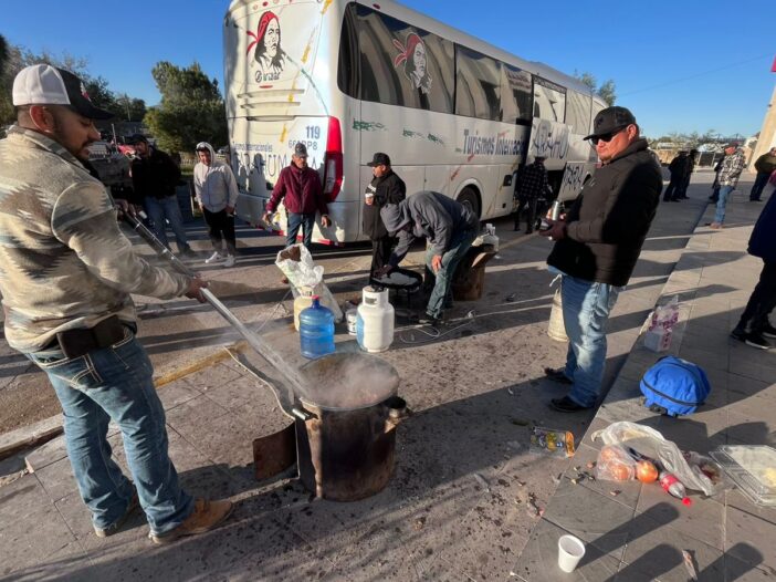 Justo en el patio de maniobras externo al puente internacional Zaragoza, decenas de manifestantes, incluyendo personas menonitas y tarahumaras que llevaban a sus familias, incluyendo mujeres y niños, pusieron discos con quemadores para preparar comida.