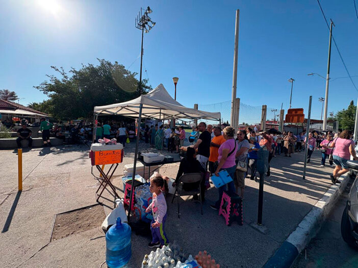 Los alrededores se transformaron en un pequeño mercado improvisado: puestos con burritos calientitos, hieleras con sodas y aguas y mesas con servicios exprés de impresión de CURP y copias al instante.