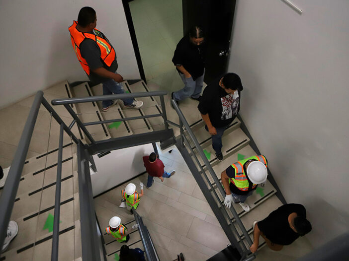 La hilera de personas comenzó a bajar por las escaleras, ya que en este tipo de situaciones no se recomienda el uso de ascensores, algunas mujeres en tacones se quejaron de que era más peligroso caminar con ese tipo de zapatos que el fingido sismo.