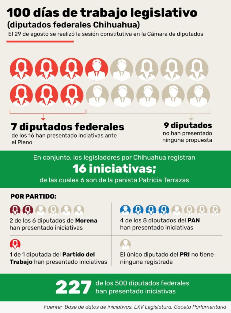 En conjunto, los legisladores por Chihuahua han presentado 16 iniciativas, apenas una por cada uno, en promedio. Sin embargo, seis de ellas pertenecen a una sola diputada.