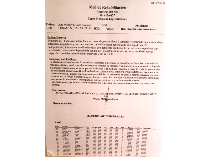 La familia Mendivil solicita el apoyo de la comunidad ya que a la joven Dana Luna Mendivil de 14 años le fue diagnosticado Síndrome de Guillain-Barré en etapa aguda, por lo que requiere de un tratamiento muy costoso. La familia no cuenta con la cantidad para poder iniciar su tratamiento y poder frenar la bacteria.