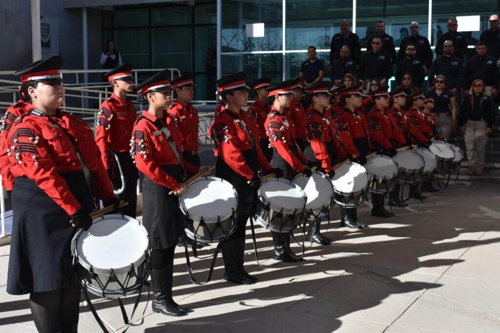 Estudiantes de dos instituciones educativas participaron este día en la ceremonia mensual de honores a la bandera en la Fiscalía de Distrito Zona Norte como parte de las acciones de fortalecimiento cívico que realiza la Fiscalía General del Estado (FGE).