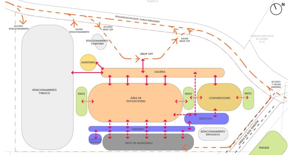También tendrá un salón de convenciones de dos mil 800 metros cuadrados, tres patios, un parque, zona de estacionamiento con 638 cajones, patio de maniobras, estacionamiento para autobuses y estacionamiento para empleados, entre otros espacios.