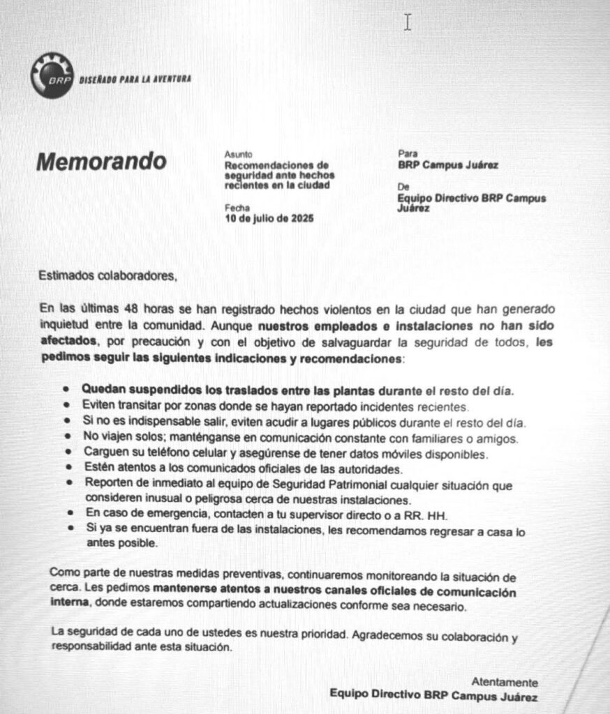 En el escrito, el equipo directivo de BRP Juárez informa a sus colaboradores que fueron suspendidos los traslados entre las plantas lo que resta del día.
