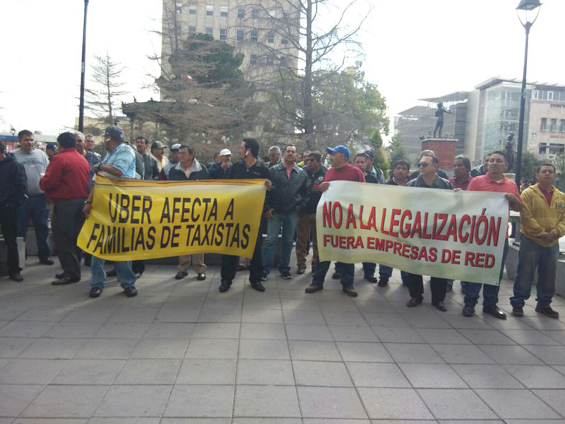 Un grupo de por lo menos 100 taxistas se manifestaron en el Congreso del Estado en contra del servicio de transporte Uber, al que acusan de afectar su patrimonio y operar de manera ilegal