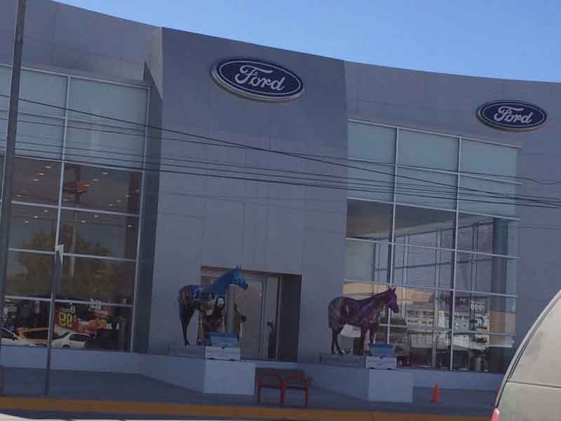 Las esculturas de caballos donadas por artistas locales al municipio son exhibidos en la agencia Ford