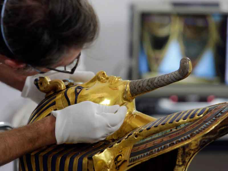 El pegamento inadecuado aplicado en la barbilla de la indumentaria del faraón está siendo retirado minuciosamente