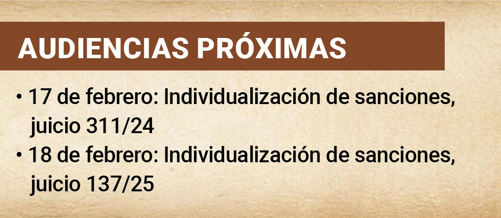 A lo anterior se suman otras actuaciones judiciales pendientes: una audiencia inicial correspondiente a la causa penal 3470/24, programada para el 20 de marzo, y dos audiencias intermedias, previstas para el 31 de marzo y el 11 de mayo.