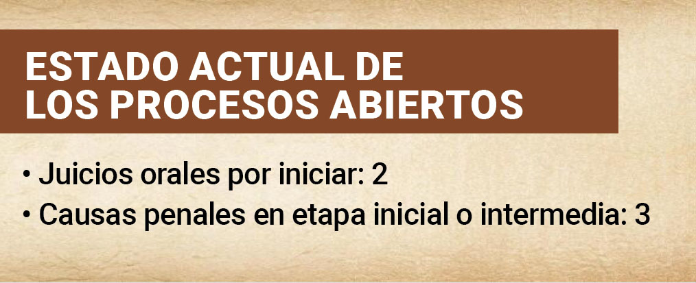 El juicio oral 170/25 tiene programado su inicio para el próximo 9 de marzo. En tanto, el juicio 70/25 permanece sin fecha definida, luego de que el juez José Marco Arredondo Ávila declinó conocer el caso el pasado 29 de enero.