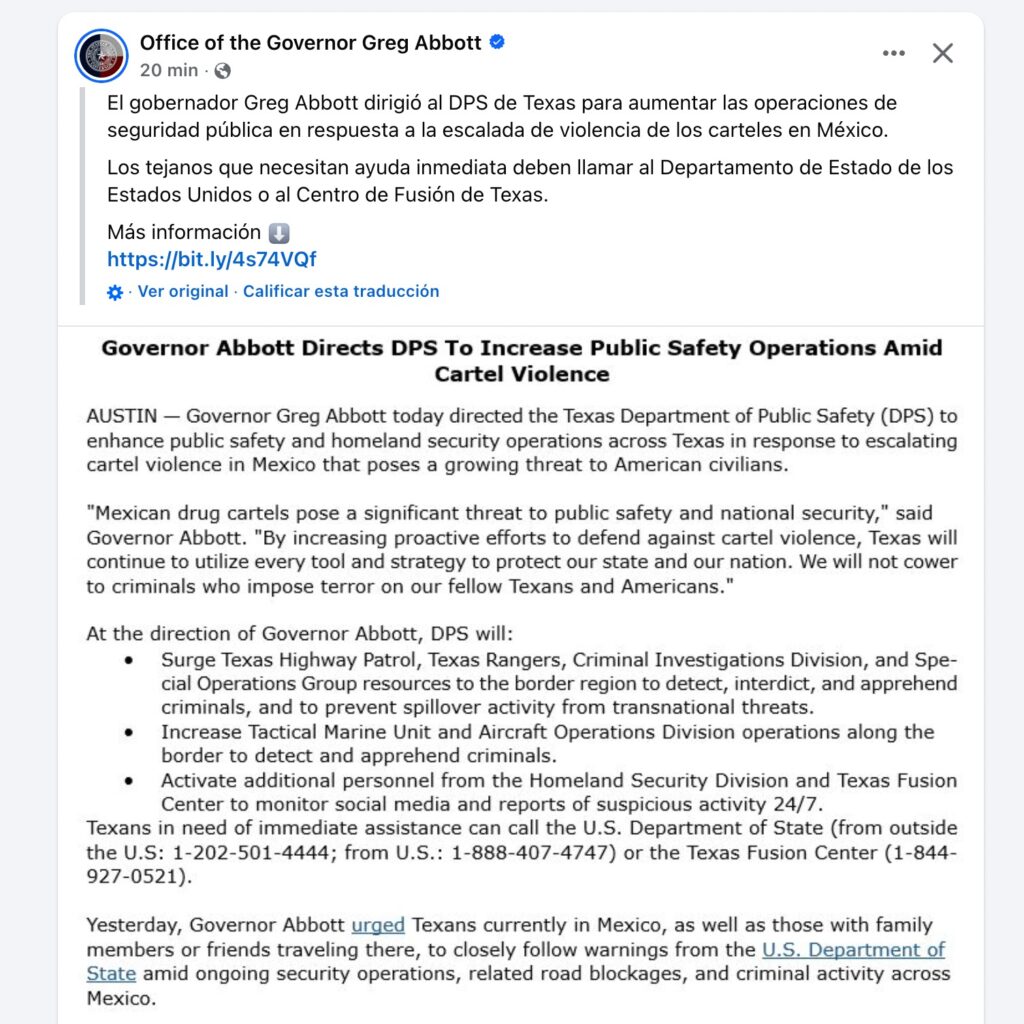 El gobernador de Texas, Greg Abbott, instruyó al Departamento de Seguridad Pública de Texas (DPS por sus siglas en inglés) a incrementar las operaciones de seguridad pública en el estado, particularmente en la región fronteriza, como respuesta a la escalada de violencia atribuida a cárteles en México.