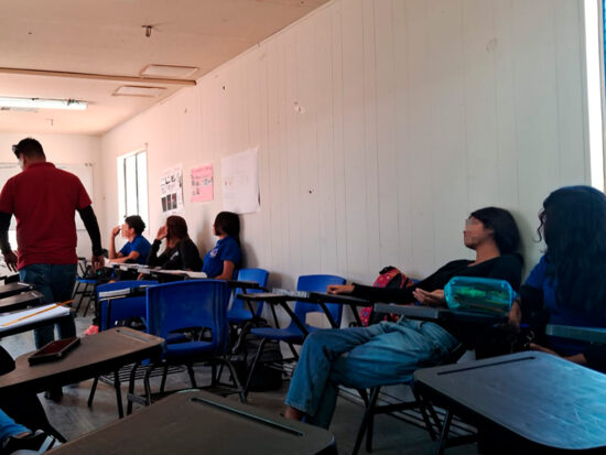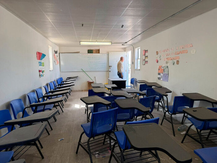 Personal de Servicios Educativos del Estado de Chihuahua (Seech) trabaja en la habilitación de aulas móviles en al menos dos escuelas secundarias del sector suroriente de esta frontera, donde toman clases de manera improvisada poco más de 500 alumnos.