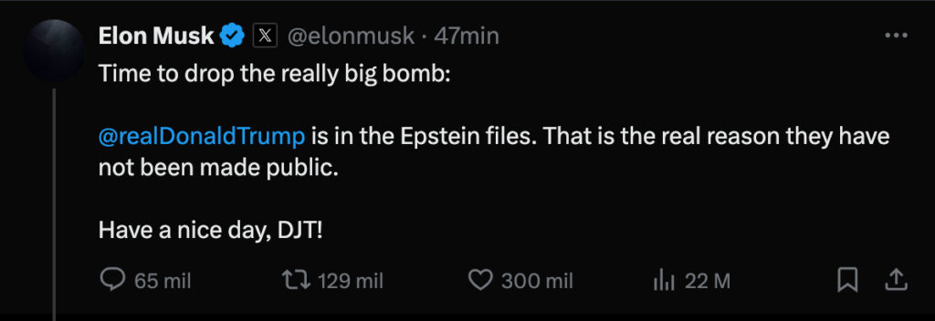 El empresario multimillonario Elon Musk, dueño y fundador de Tesla y Space X, publicó este jueves en su perfil de X (antes Twitter), que el presidente de Estados Unidos, Donald Trump, está incluido en los archivos Epstein, y que por eso no han sido divulgados.