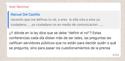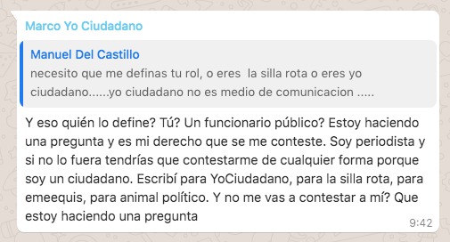 “Escribí para Yo Ciudadano, para La Silla Rota, para emeequis, para Animal Político ¿Y no me vas a contestar a mí que estoy haciendo una pregunta?”, reviró López Romero.