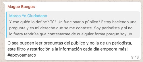 “La actitud de trato aberrante hacia la prensa debe cesar ya! Apoyo a Marco. Merece una disculpa pública”.