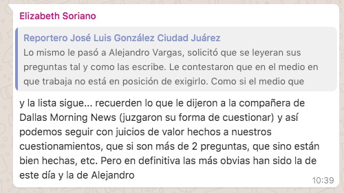 “Recuerden lo que le dijeron a la compañera del Dallas Morning News (juzgaron su forma de cuestionar) y así podemos seguir con juicios de valor hechos a nuestros cuestionamientos, que si son más de 2 preguntas, que si no están bien hechas”, cuestionó.