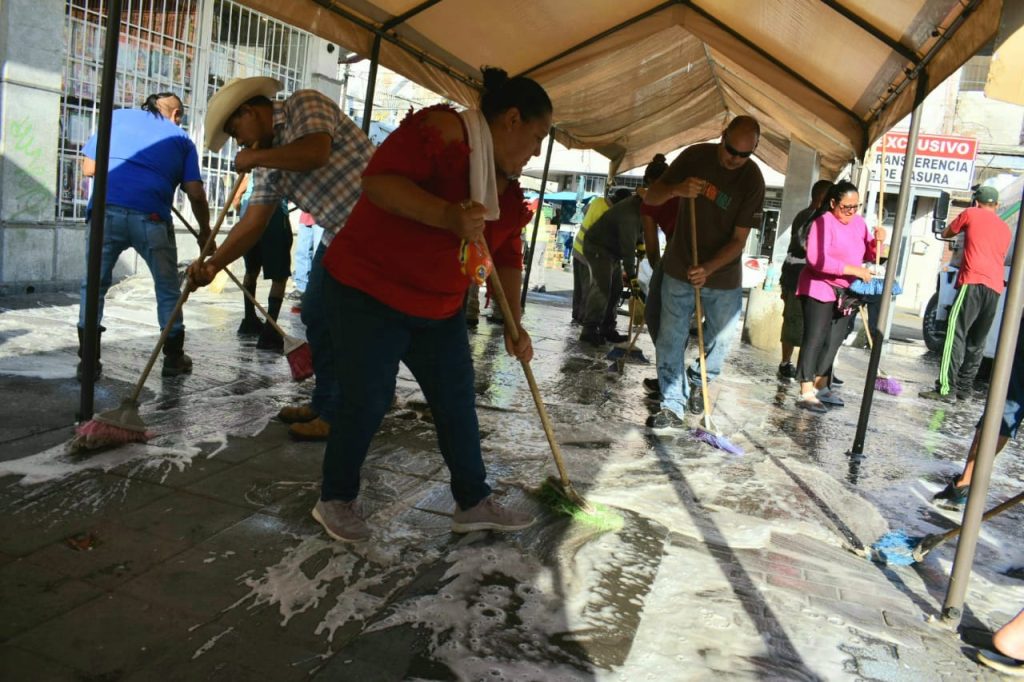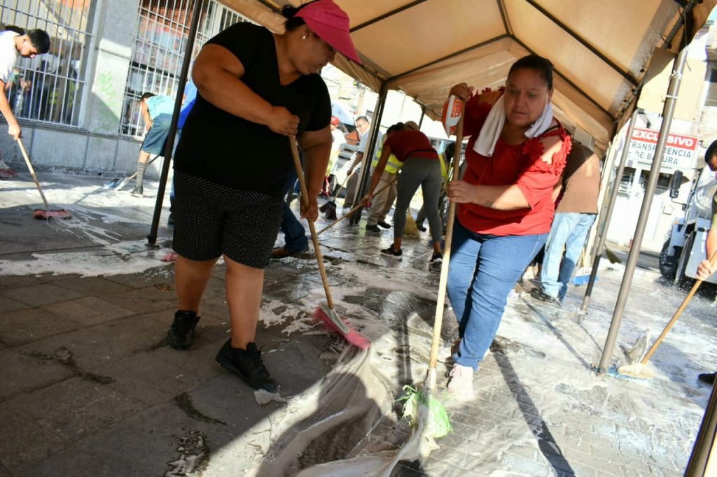 La mañana de este miércoles, comerciantes del primer cuadro de la ciudad con apoyo de trabajadores de la Dirección General de Servicios Públicos limpiaron el Centro Histórico.