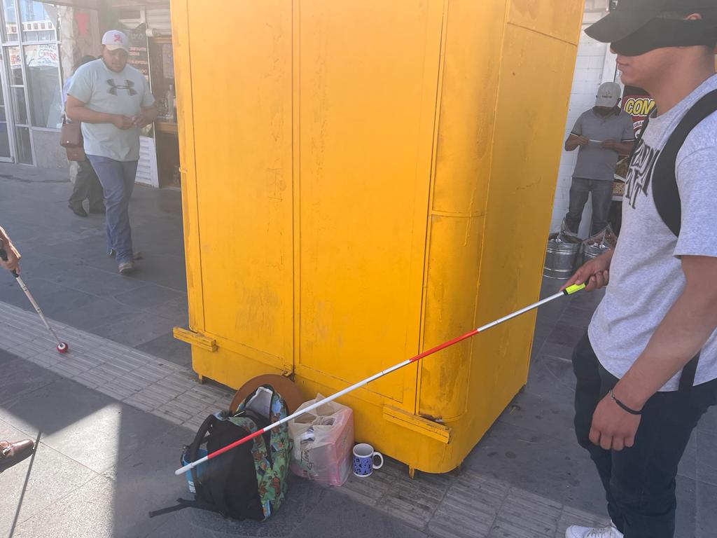 Joel, estudiante de la carrera de diseño urbano de la UACJ, caminó con un antifaz que le impedía ver, y un bastón especial para invidentes, como parte de este ejercicio que también sirvió de concientizacion y sensibilización.