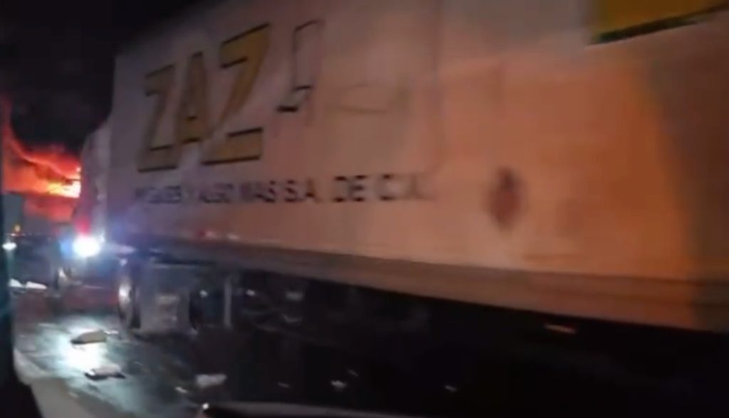 El otro tráiler que aparece impactado, con su caja visiblemente dañada tras el choque en su parte trasera, pertenece a la compañía “ZAZ”, Muebles y Más, S.A. de C.V., según alcanza a verse en el video.