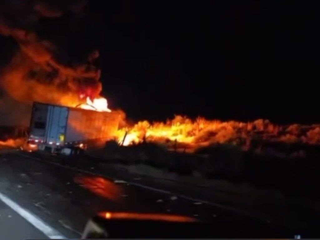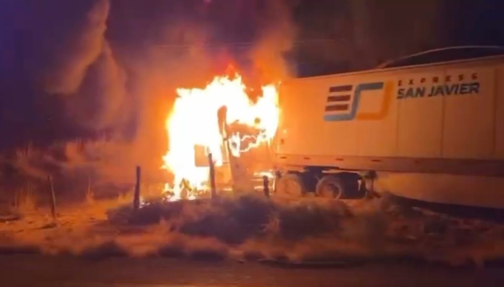 En las imágenes se observa claramente uno de los tráileres perteneciente a la compañía “EXPRESS SAN JAVIER”, completamente salido de la carretera, con su caja inclinada y envuelto en intensas llamas naranjas y rojizas que se elevan hacia el cielo nocturno, generando grandes columnas de humo negro y espeso que iluminan la oscuridad.