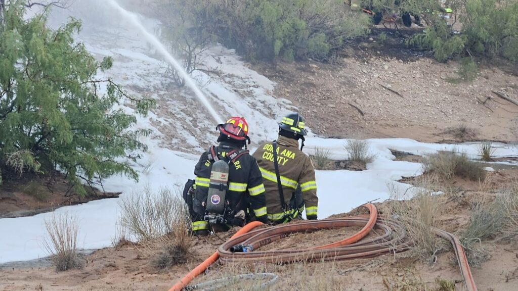 En un video difundido por Doña Ana County Public Safety, se observó cuando elementos de Bomberos realizaban las maniobras para sofocar las llamas que se formaron en el punto donde se impactó la aeronave.