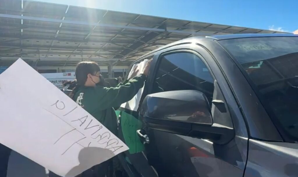 No hubo porras, aplausos ni mensajes de respaldo. El recibimiento estuvo marcado exclusivamente por reclamos, visibles en cartulinas de colores fosforescentes —naranja, verde y rosa— que concentraron el núcleo de la protesta.