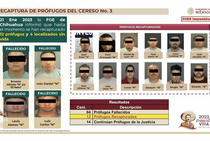 “El avance de prófugos recapturados del Cereso número 3 de Ciudad Juárez que se evadieron el día primero de enero este año, eran 30, a la fecha, cuatro han fallecido, 12 ya han sido recapturados y continúan 14 aún prófugos de la justicia”, detalló.