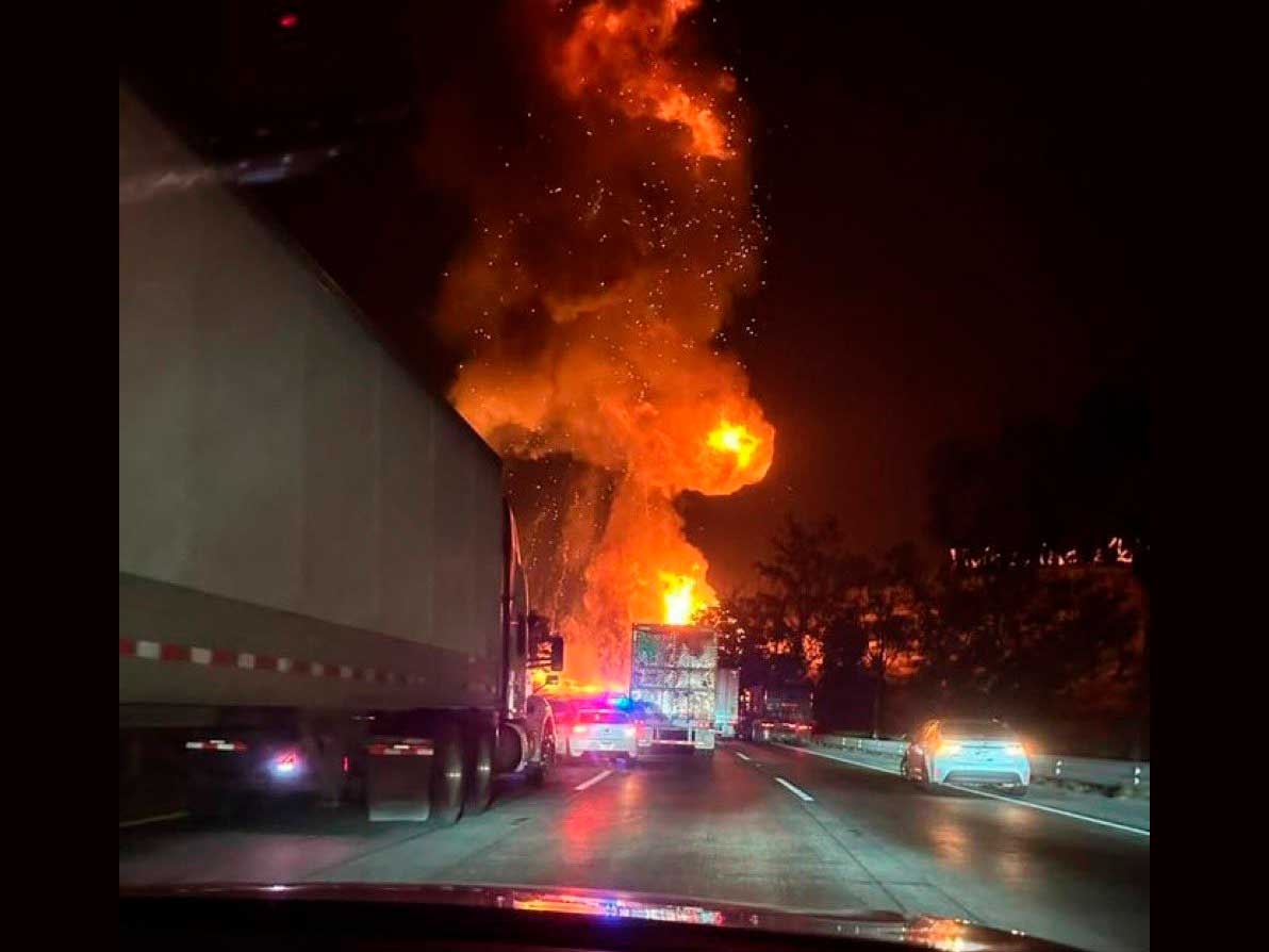 Una pipa que transportaba gas LP volcó e impactó contra la valla de contención, lo que derivó en un incendio de gran magnitud y una detonación que generó una enorme bola de fuego y columna de humo visible desde varios kilómetros a la redonda.