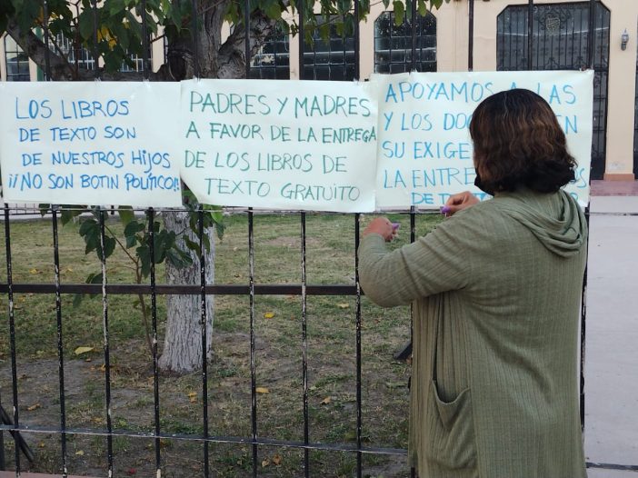 Los padres de familia colocaron pancartas en las afueras del plantel y decidieron no llevar a sus hijos a la escuela, que continúa con clases normales, como medidas de protesta para mostrar su descontento con la decisión judicial de cancelar la entrega de libros.