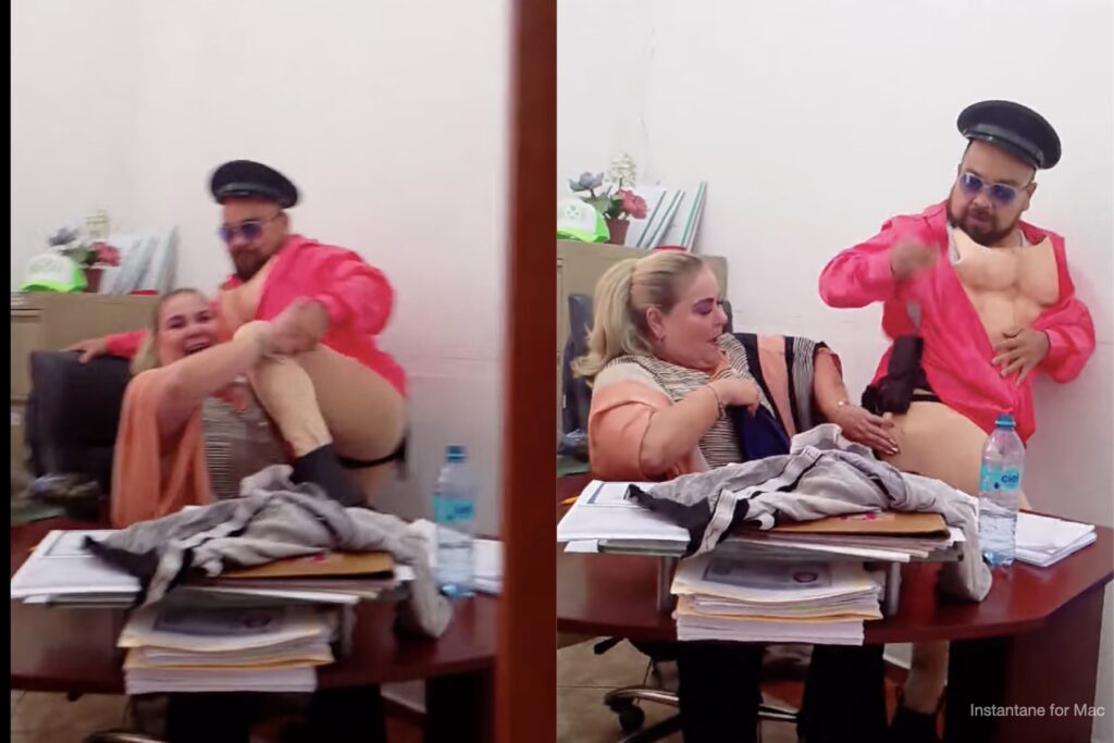 Las imágenes, difundidas ampliamente en redes sociales desde el fin de semana pasado (alrededor del 20 de febrero), captan a la funcionaria sentada en su escritorio mientras un hombre —conocido en el material como “Sexy Boy” o “Rasiel Ochoa II”— ingresa disfrazado (con mallas, pectorales de goma, gorro tipo quepí de policía y elementos de botarga).