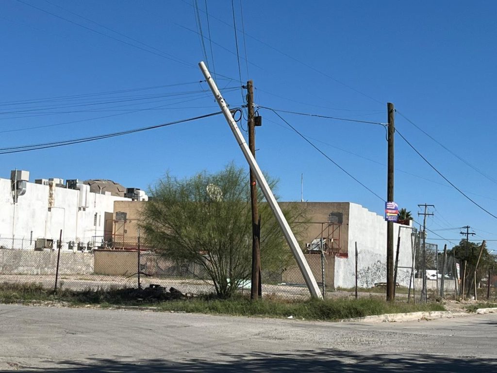 Un poste de servicio eléctrico se encuentra inclinado y está a punto de colapsar en el cruce de las calles Estebanico y Fray Pedro de Gante, a un costado de la Plaza San Lorenzo.
