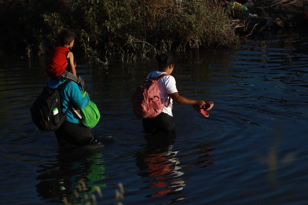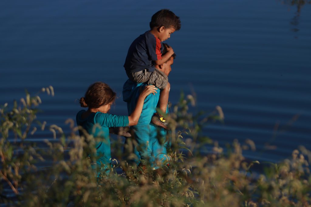 Otro adulto se balancea con un menor en los hombros, mientras del otro lado observan su paso. Lo han logrado. Están en tierras estadounidenses.