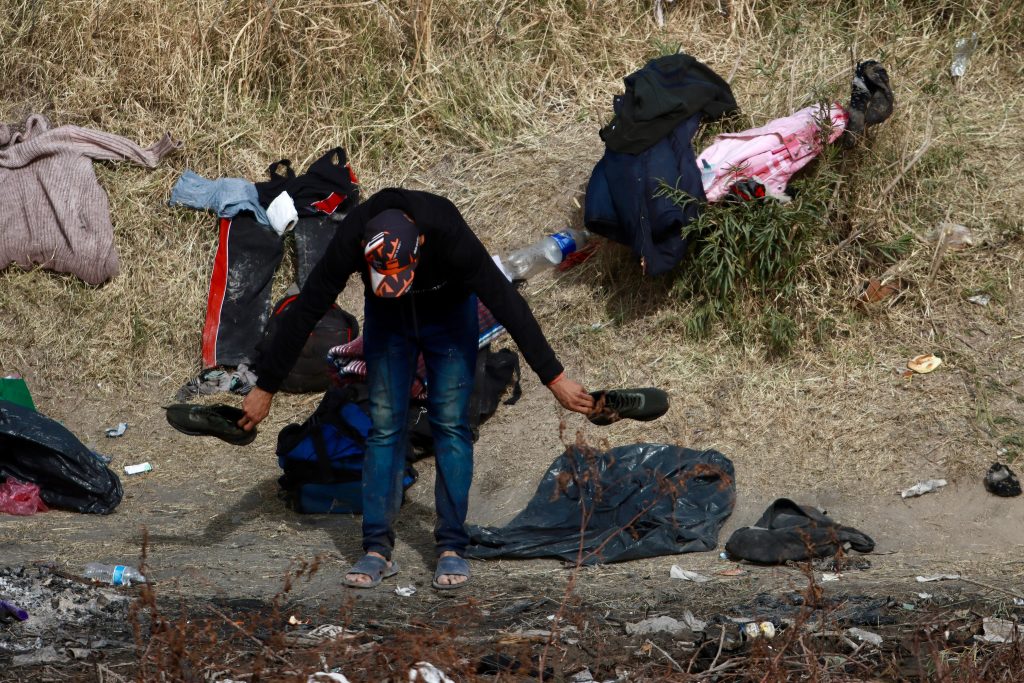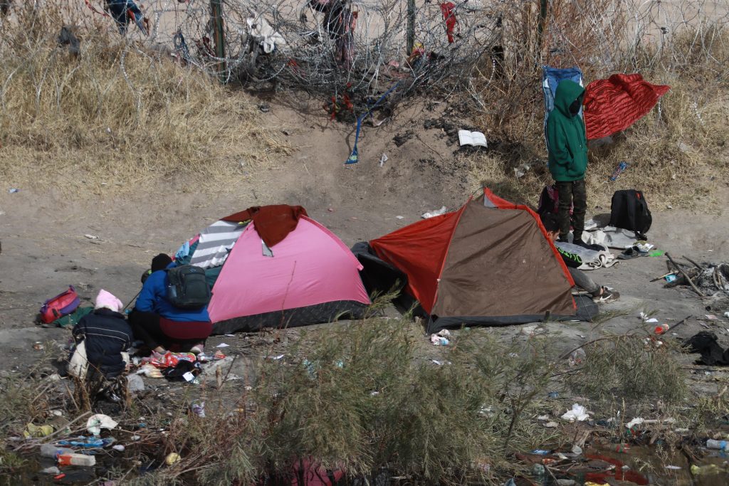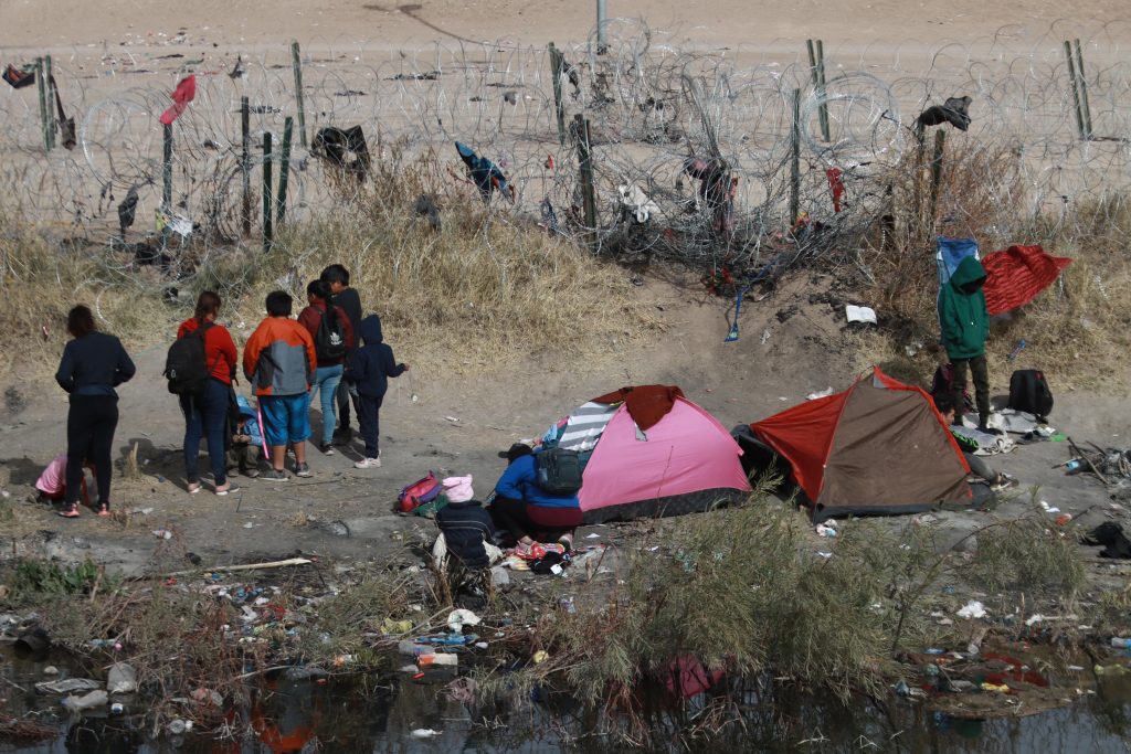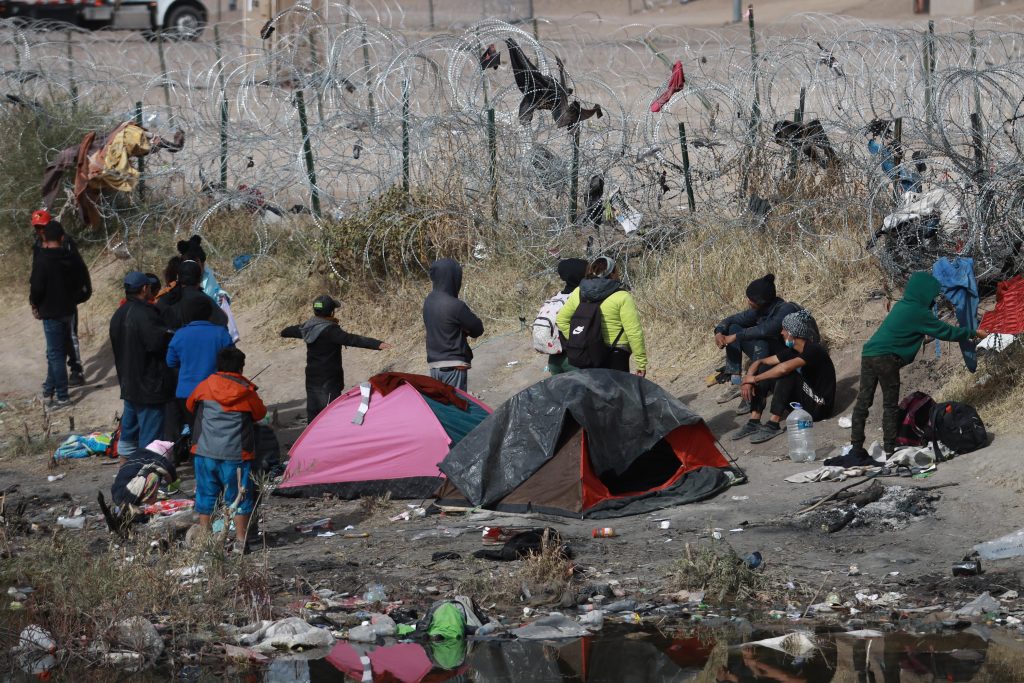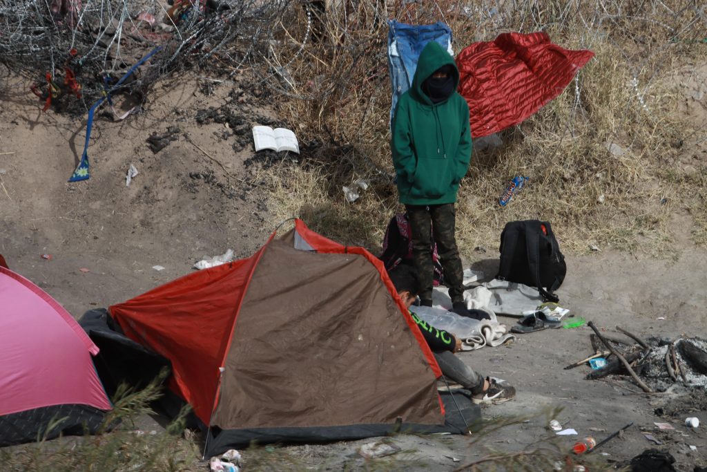 Del otro lado de la reja, agentes de la Guardia Nacional de Texas, que reforzaron la seguridad, observan a los migrantes que caminan en su improvisado campamento.