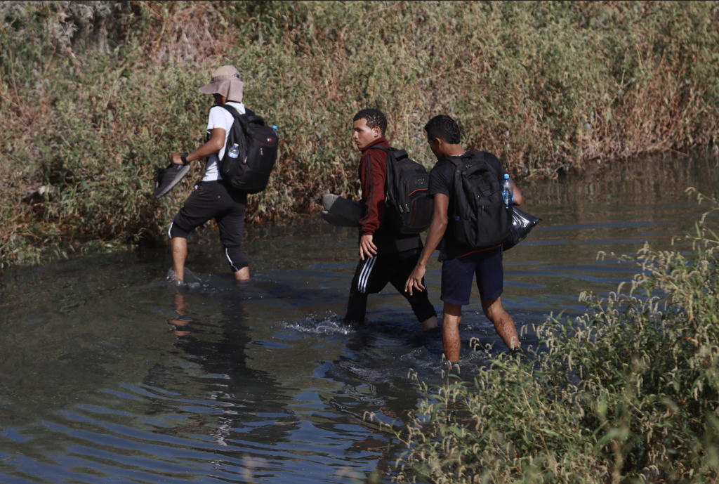 Luego de cruzar el río Bravo, caminan alrededor de cien metros hasta llegar al muro.