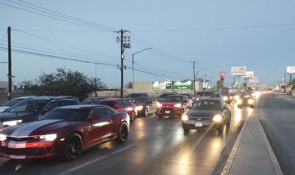 En el Puente Internacional Paso del Norte la fila de vehículos que se hace en la avenida 16 de septiembre provoca que los conductores tengan que esperar alrededor de una hora para cruzar la frontera.
