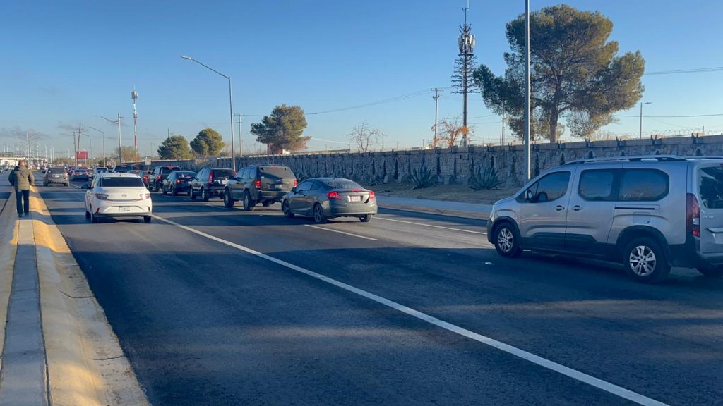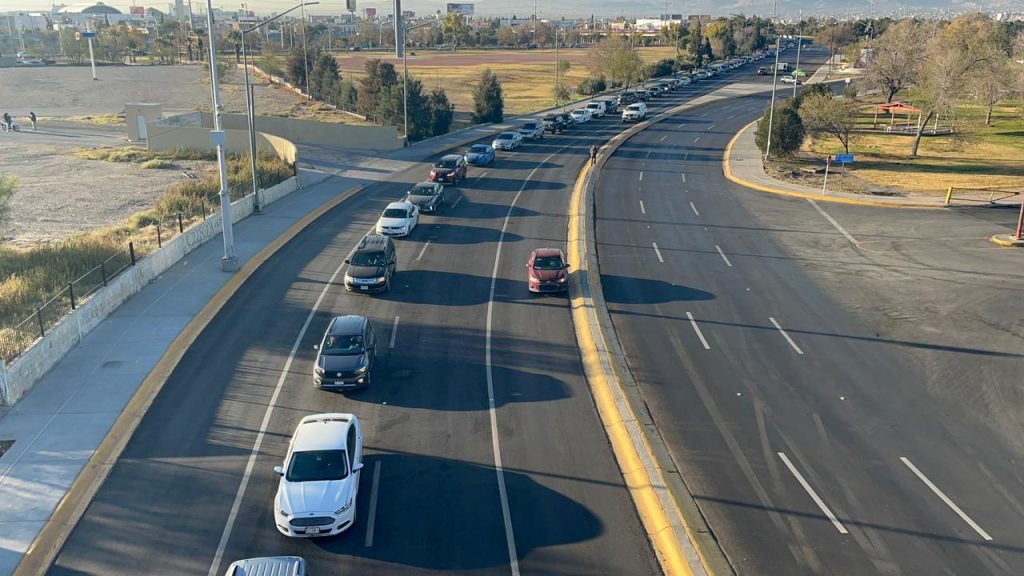 En el Puente Paso del Norte la fila de vehículos se encuentra a lo largo de la avenida Juárez, y con 8 garitas abiertas provoca que el tiempo para cruzar sea de aproximadamente una hora con 10 minutos.