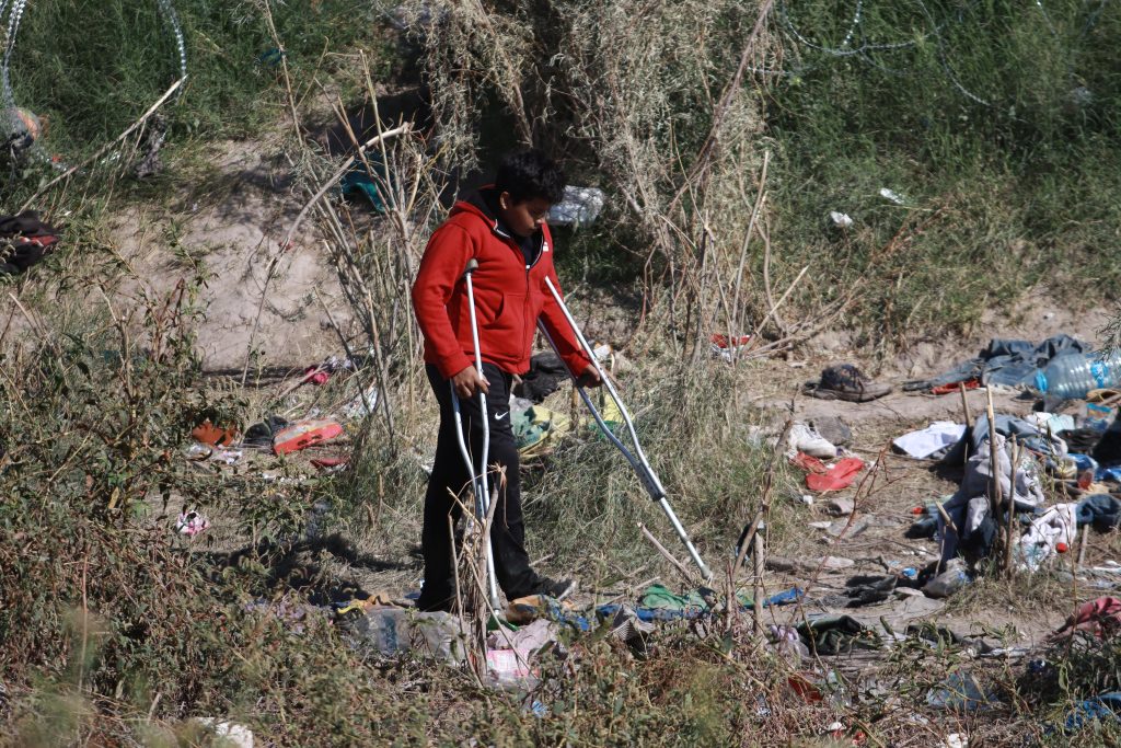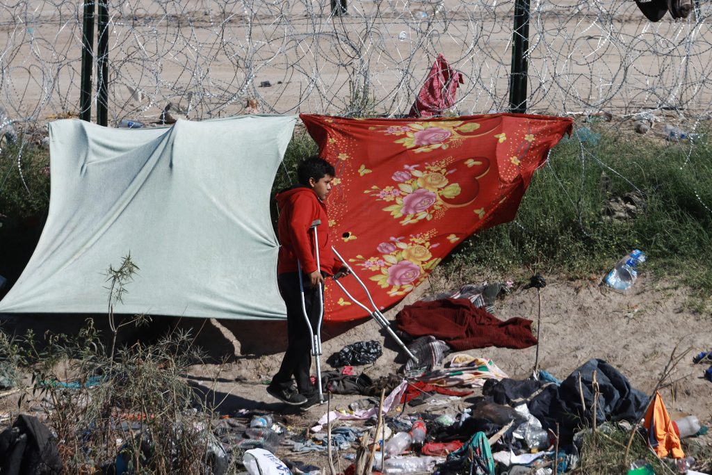 Caminar en muletas entre basura y desechos no es fácil, aunque eso parece no ser un impedimento para la mayoría de quienes pernoctan bajo improvisadas casas de campaña.