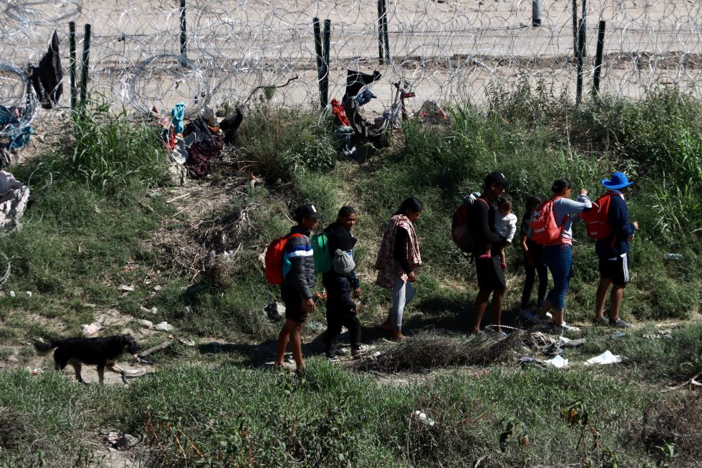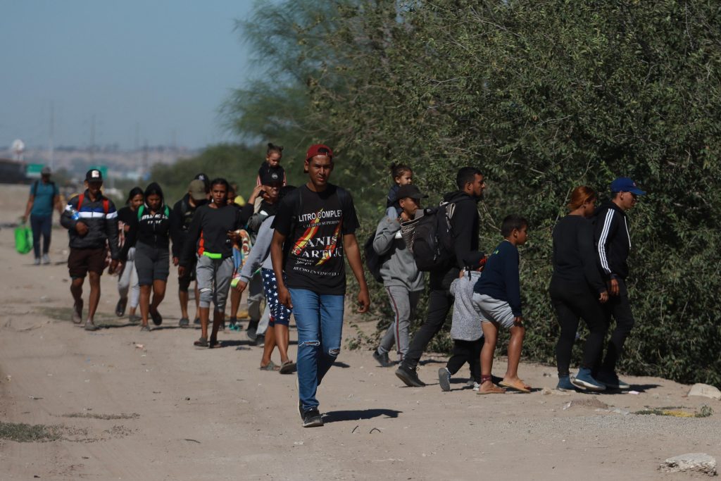 Adultos con niños en los hombros caminan bajo los rayos de un sol fronterizo que se niega a darle paso al otoño, mientras la temperatura marca 29 grados centígrados.