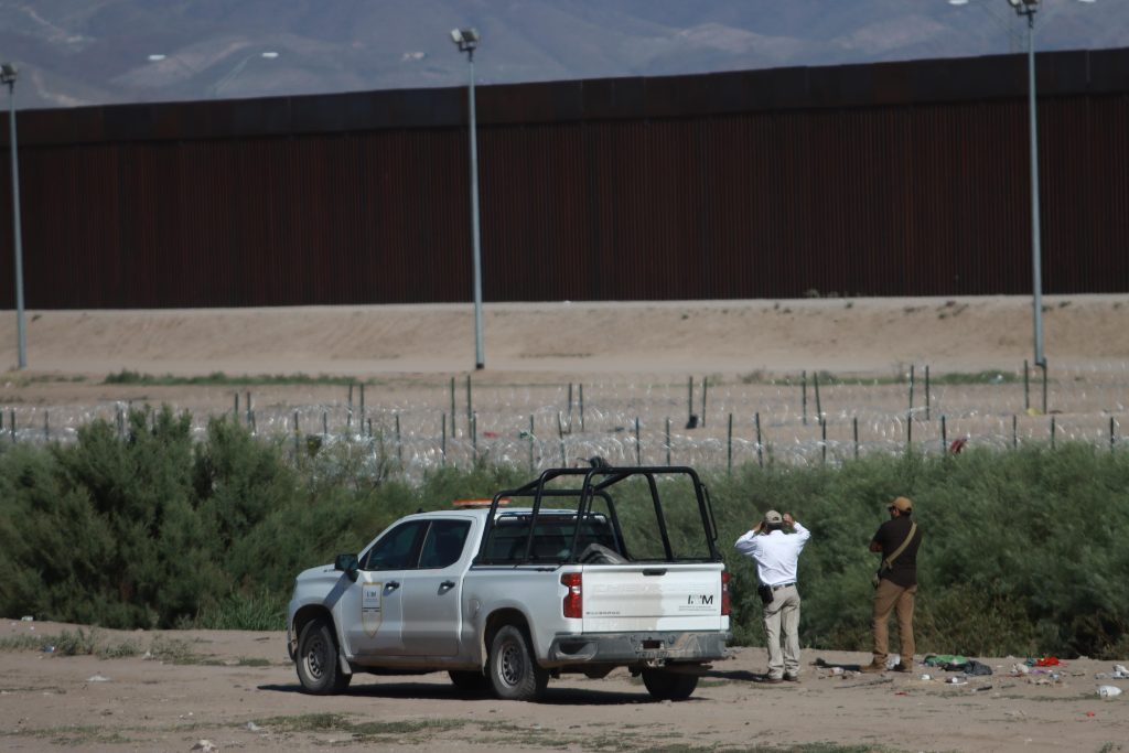 Mientras diferentes grupos de indocumentados avanzan entre la maleza y el bullicio de otros viajeros, varias unidades del Instituto Nacional de Migración (INM) están sobre le bordo del río. Traen el logo del Gobierno de México.