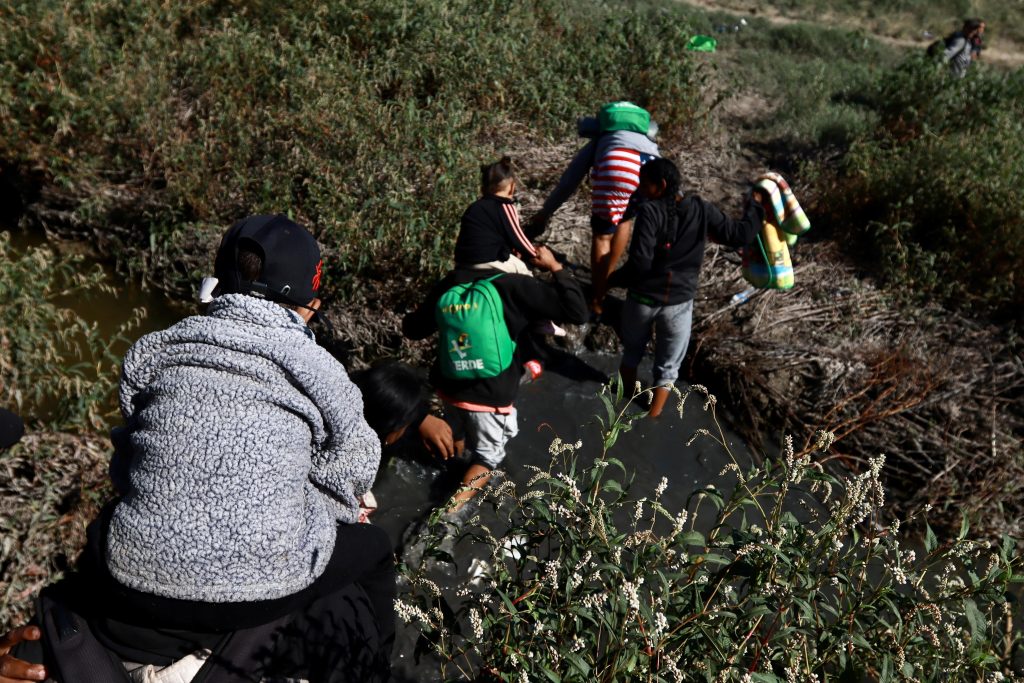 Desde el lado mexicano una familia avanza. Sus integrantes se hicieron un doblez en el pantalón para evitar mojarse.