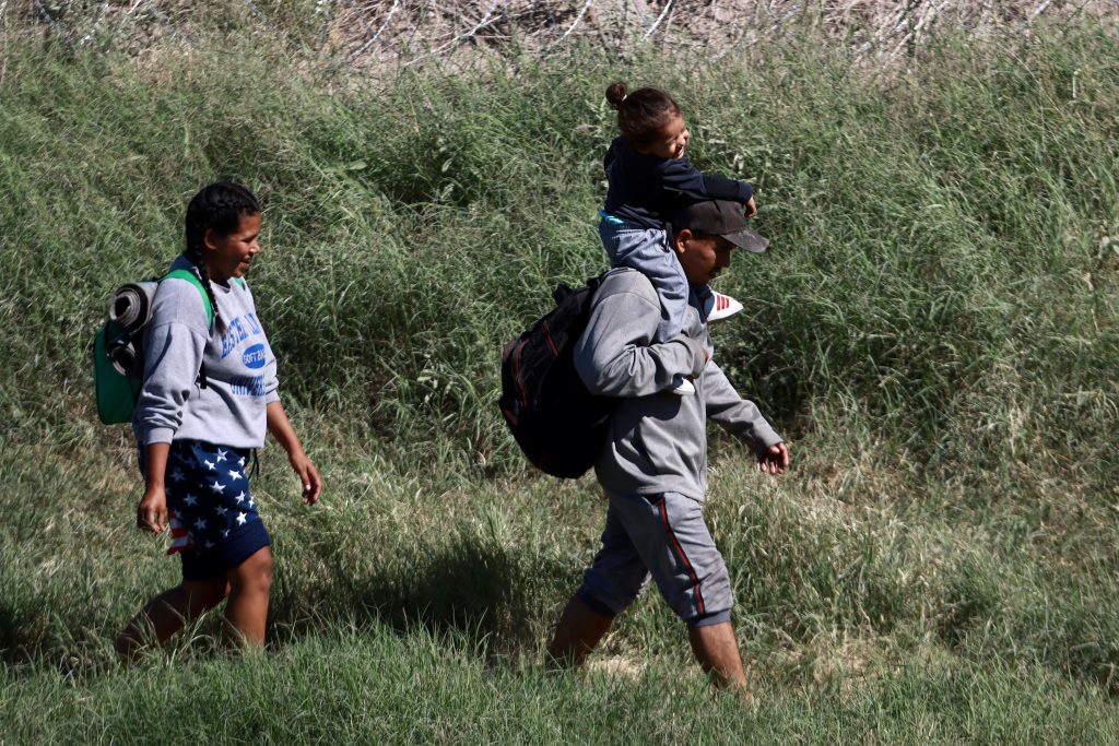 Una menor, en hombros de su padre, parece haber olvidado los casi 5 mil de kilómetros de distancia que ha recorrido desde su natal Venezuela. Ahora sonríe, quizá, porque sabe que están a punto de alcanzar el sueño americano, la caricia del tío Sam.