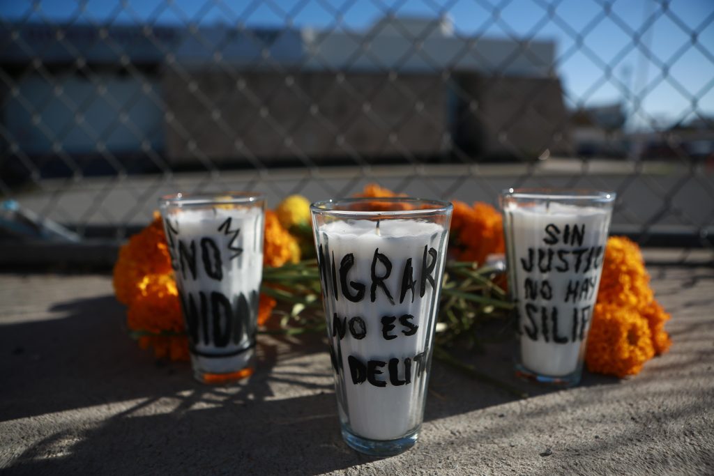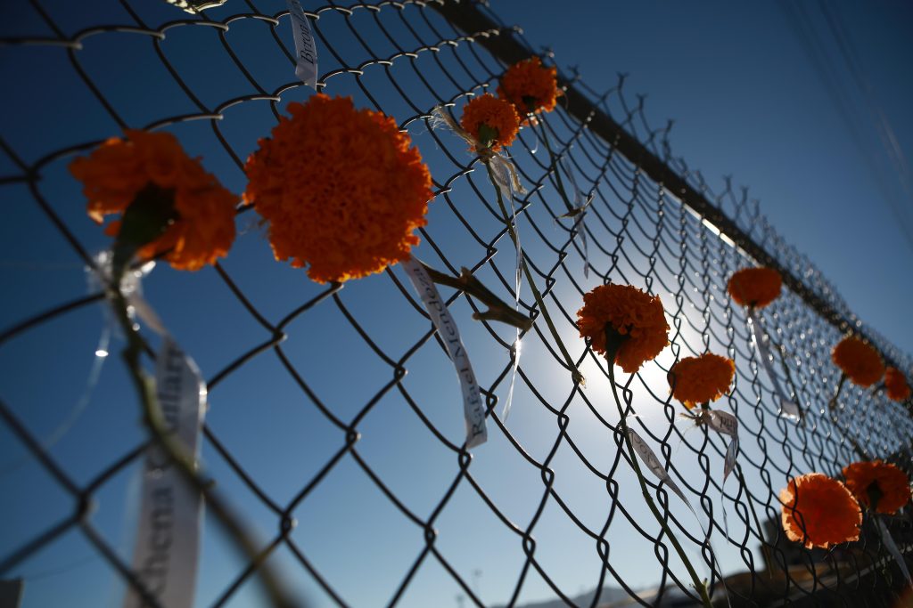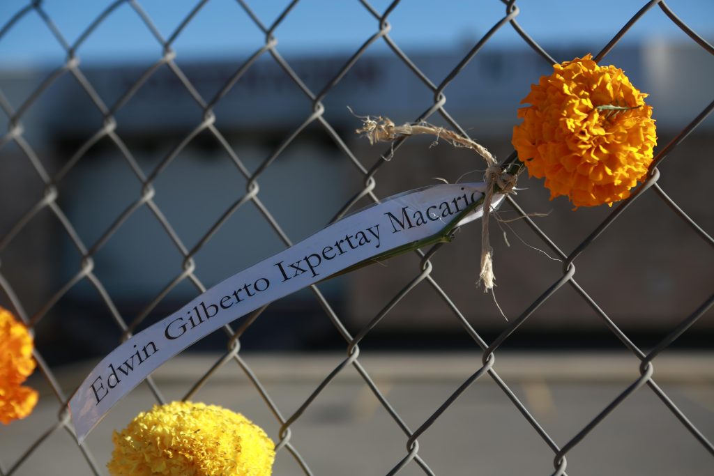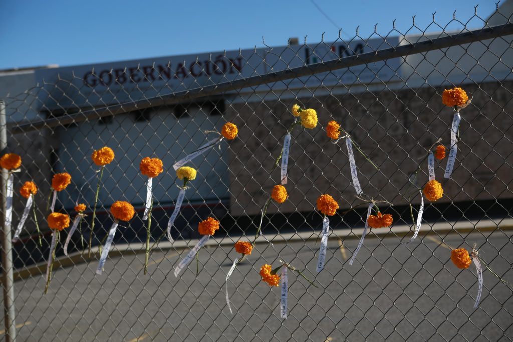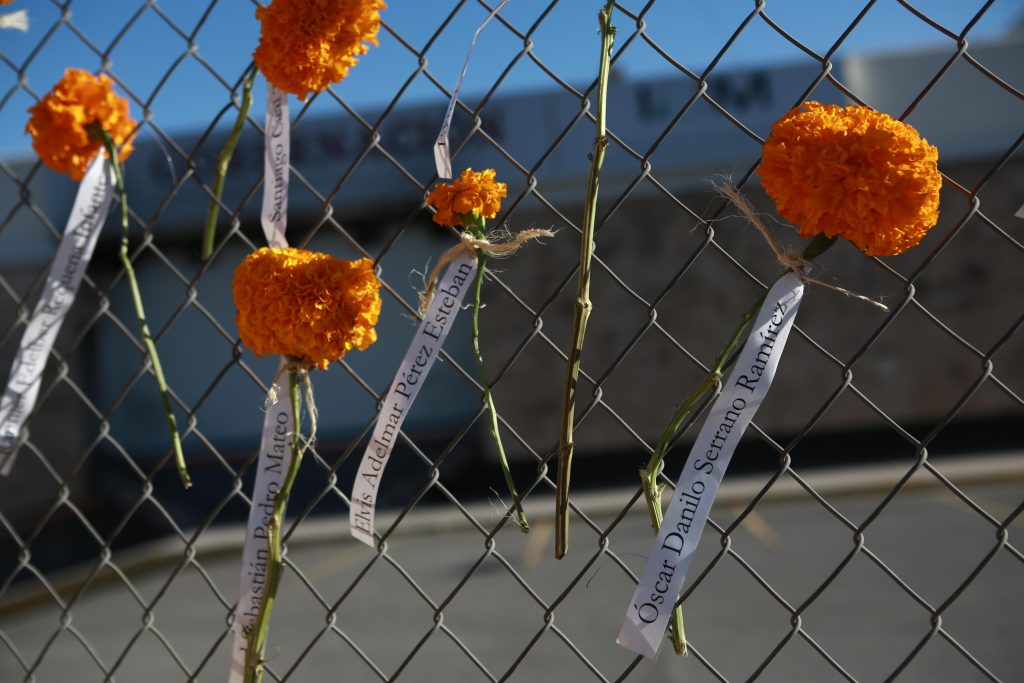 Activistas de Derechos Humanos Integrales en Acción (DHIA) colocaron flores de cempasúchil en la reja del excentro de detención del Instituto Nacional de Migración, donde murieron 40 migrantes y 27 más resultaron lesionados.