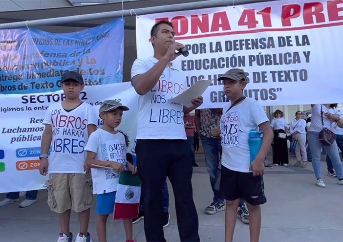 En estos momentos más de mil personas, entre las que se encuentran maestros, padres de familia y activistas, se encuentran en el exterior de Pueblito Mexicano para exigir la entrega de libros de texto a los alumnos de nivel básico.