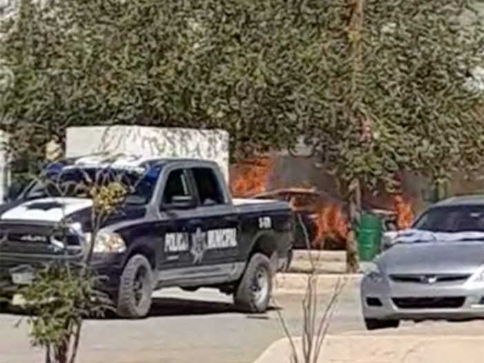 Dos videos muestran cómo un auto estacionado afuera de una vivienda arde, mientras llegan policías municipales.